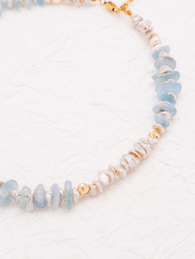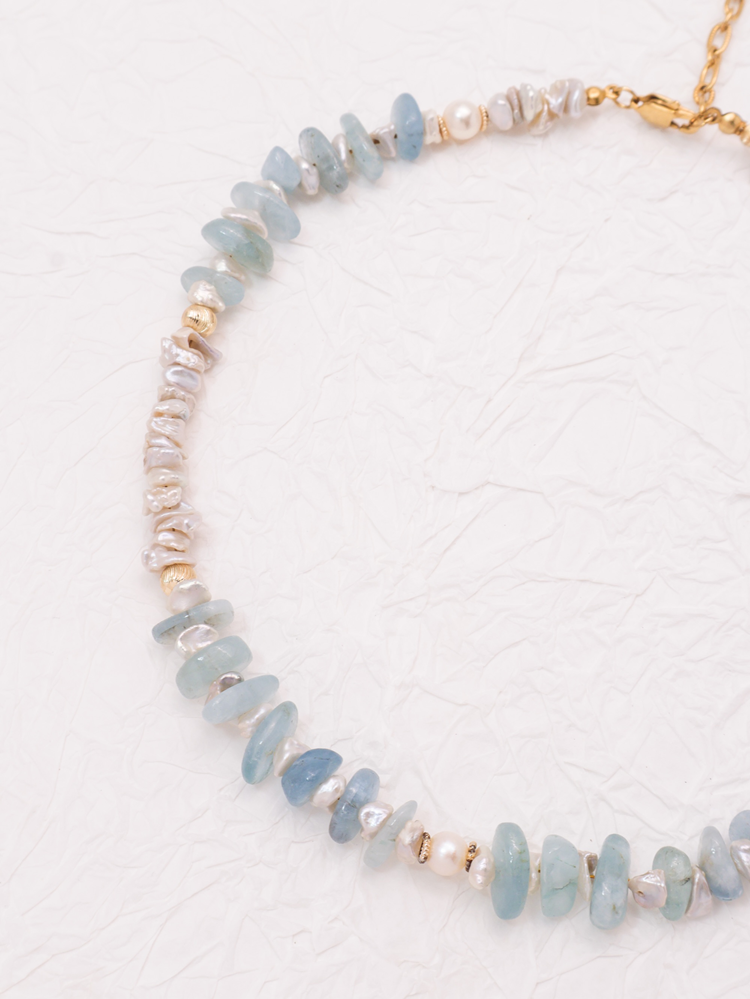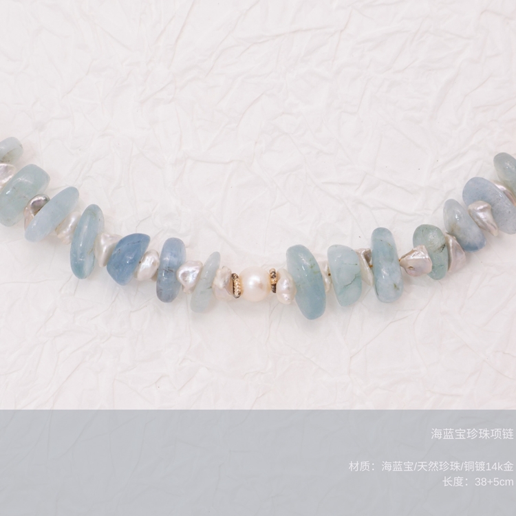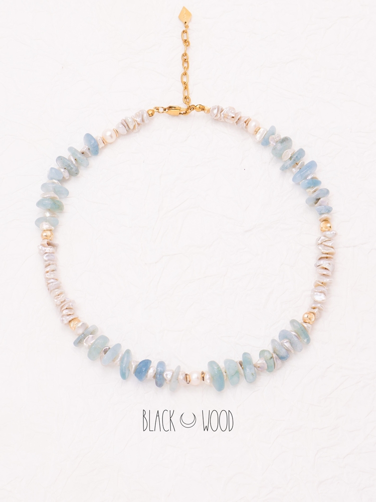 Black Wood | Aquamarine with Special-Shaped Petal Pearl Advanced Color Matching Custom Copper-Plated Gold Beaded Necklace
